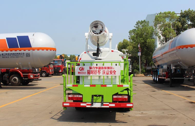 灑水車前沖(噴)、后灑、帶側噴(花灑)、帶后工作平臺、平臺上安裝綠化灑水高炮(炮噴射形狀可調節:直沖、大雨、中雨、毛毛雨、霧狀、可連續調節,360°旋轉),配消防接口,自流閥,濾網,帶自吸自排功能。