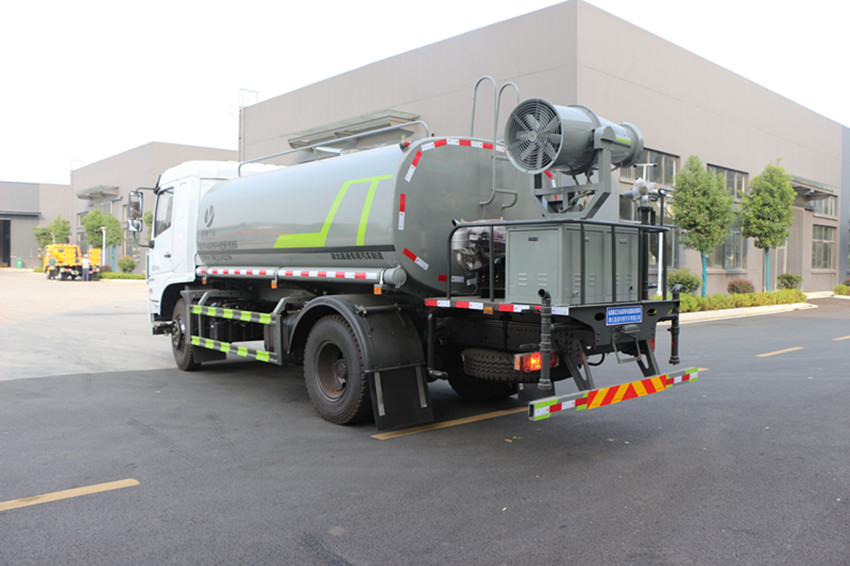由發動機帶動變速箱,變速箱上安裝的取力器帶動灑水泵,灑水泵產生主要動力,將罐體內部的液體通過管網噴灑出去。自吸高度:≤7m,灑水寬度:≥20m,射程:≥28m;可調節成柱狀,射程≥28m;也可調節成霧狀,射程≥5m。