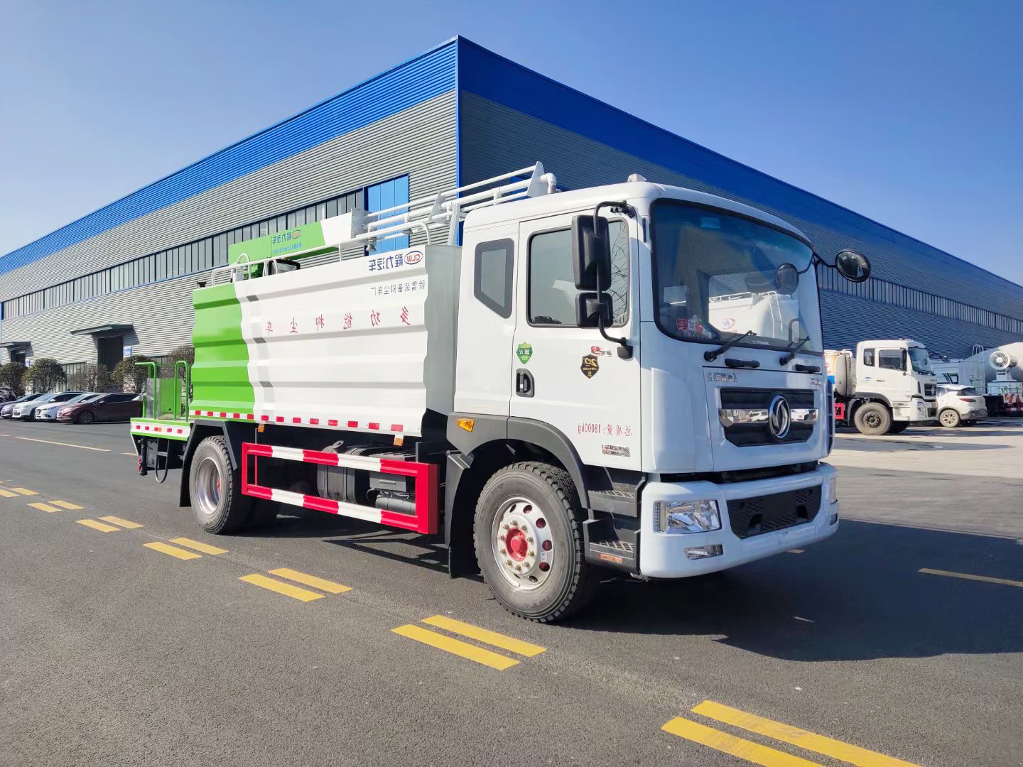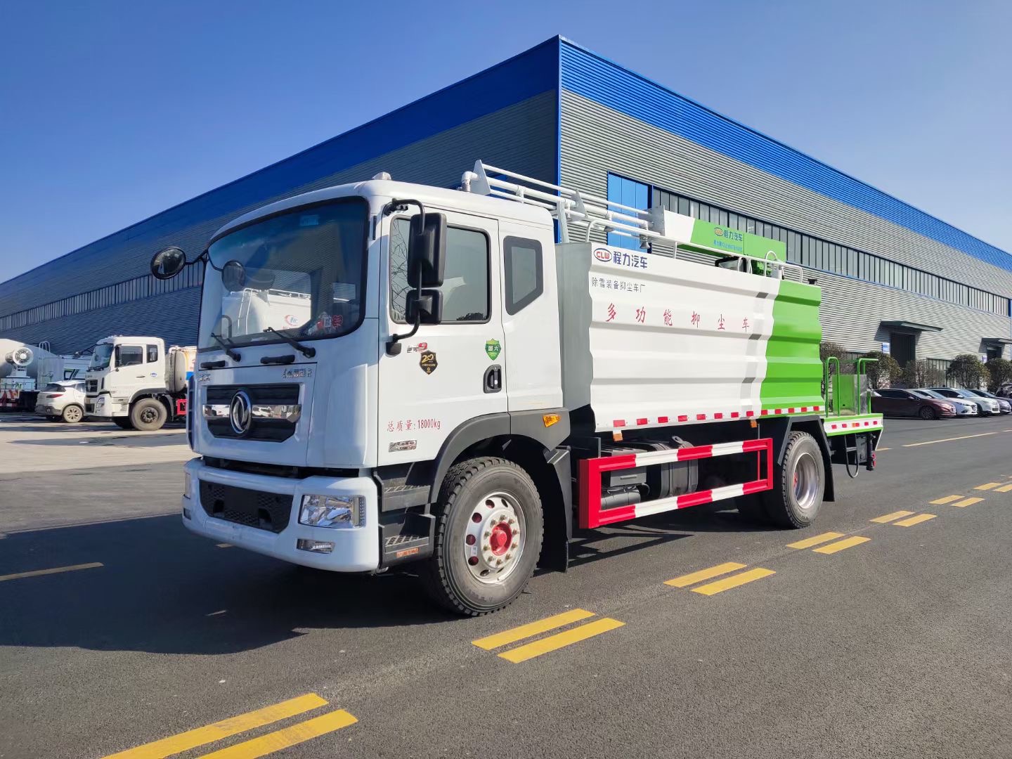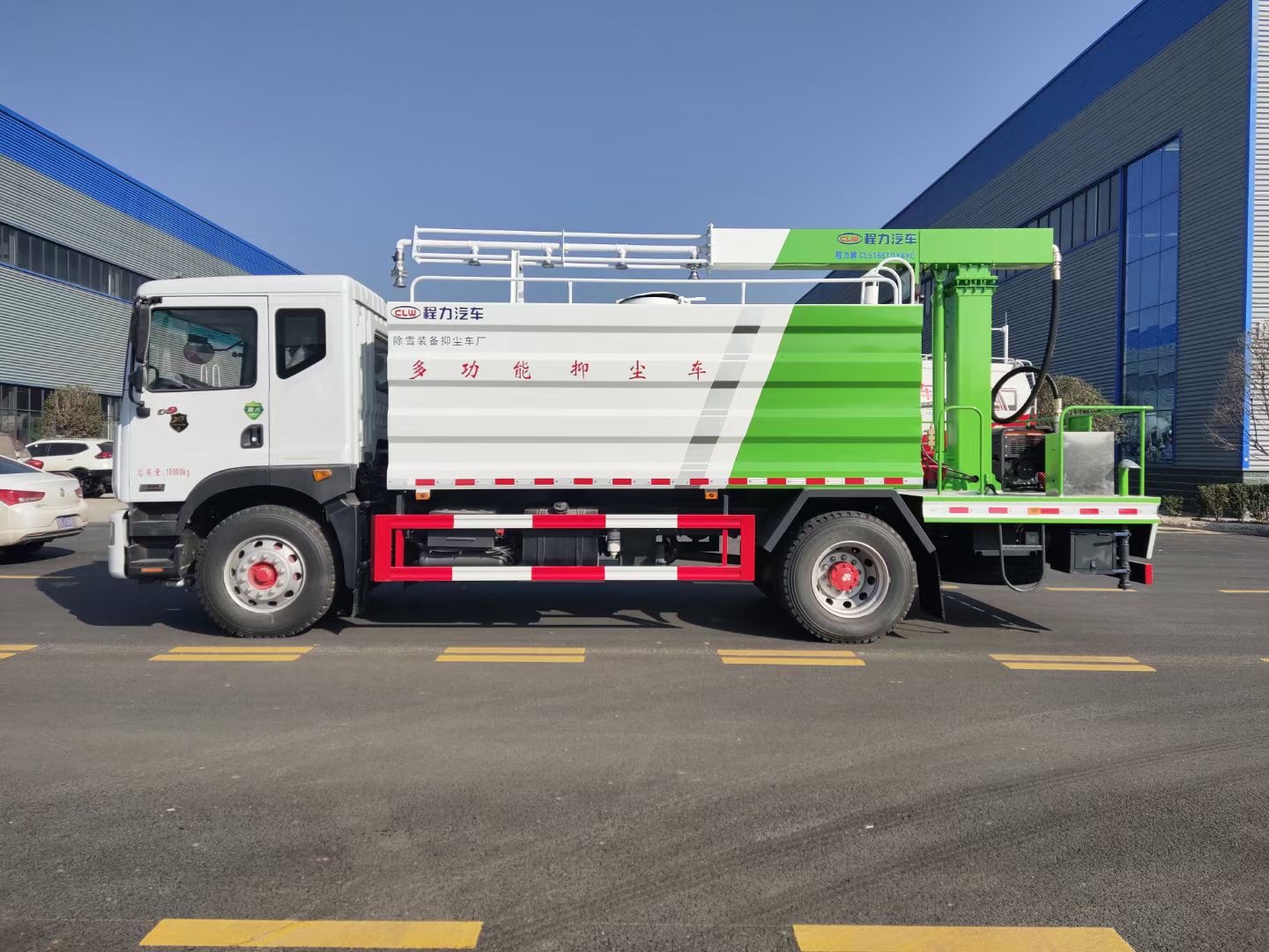 多功能抑塵車主要結(jié)構(gòu)是在行走機構(gòu)上加裝方型大容積水罐、高效遠程霧炮系統(tǒng)、大功率專用自吸自排水泵,中低壓沖洗灑水系統(tǒng)、綠化灑水高炮(可選裝自動灑水高炮,在罐體前端)等等而改裝組成。、罐體容積大(14立方),免征產(chǎn)品