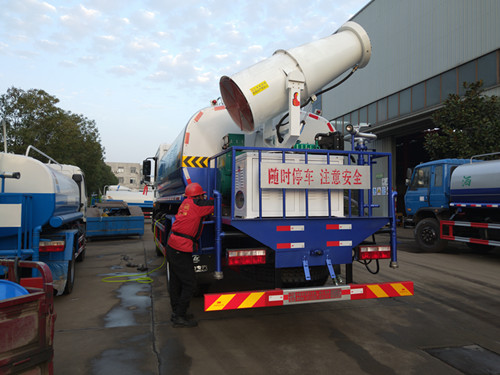 霧炮車,也叫抑塵車,工作效率約為普通灑水車的30倍。水箱中的水經(jīng)過霧化后,由高壓風(fēng)機噴出。相比普通灑水車噴出的水流,水霧顆粒極為細小,達到了微米級,其吸附力也增加了3倍,耗水量卻降低了70%,遭遇霧霾天氣、空氣質(zhì)量PM2.5嚴重超標(biāo)時,可隨意選定一個區(qū)域進行液霧降塵、分解淡化空氣中的顆粒濃度、將飄浮在空氣中的污染顆粒物、塵埃等迅速逼降地面,達到清潔凈化空氣的效果。