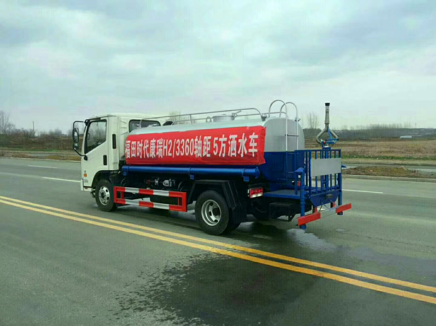 福田時代5噸灑水車,罐體實際容積5立方,凡是購買該車的用戶,灑水車廠家立送7天臨時牌照一份,灑水車的所有功能配件,均享有一年的質保期,質保期內免費更換,