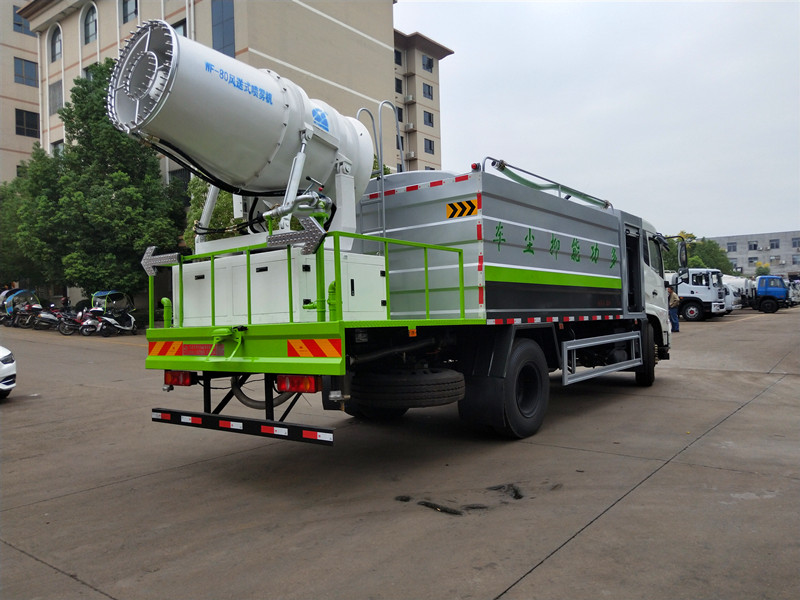抑塵車吸程≧7米,灑水寬度≧14-16米,射程≧25-40米,引水時間<5min,流量60m3/h。前沖(噴)、后灑、帶側噴(花灑)、帶后工作平臺、平臺上安裝綠化灑水高炮(炮噴射形狀可調節:直沖、大雨、中雨、毛毛雨、霧狀、可連續調節,360°旋轉),配消防接口,自流閥,濾網,帶自吸自排功能。配備大功率專用灑水泵,泵可自吸自排,安裝過濾網,帶消防接口,可通過消防栓進水,帶自流閥,此車尾部加裝大功率農藥噴灑炮,噴灑狀態霧狀,有效射程15-45米,外部平臺帶獨立的機組。