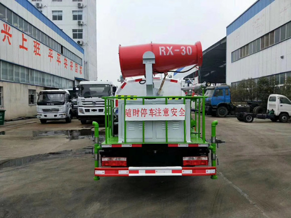 國六東風東風多利卡灑水車專用功能為:前沖后灑,側噴,罐體后帶工作平臺加護欄,平臺上安裝綠化灑水高炮,射程28米左右,可調(diào)節(jié)多種形態(tài)(大雨、中雨、霧狀),配備大功率專用灑水泵,泵可吸自排,帶自流閥,帶消防接頭,帶過濾裝置,兩根吸水管。另外該車可選裝A、后部帶弧形噴霧和LED箭頭指示燈;B、后部帶LED箭頭指示燈;C、后部帶弧形噴霧裝置。