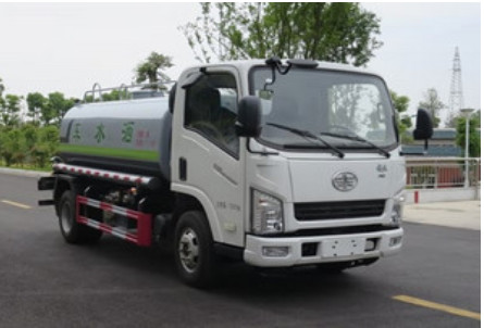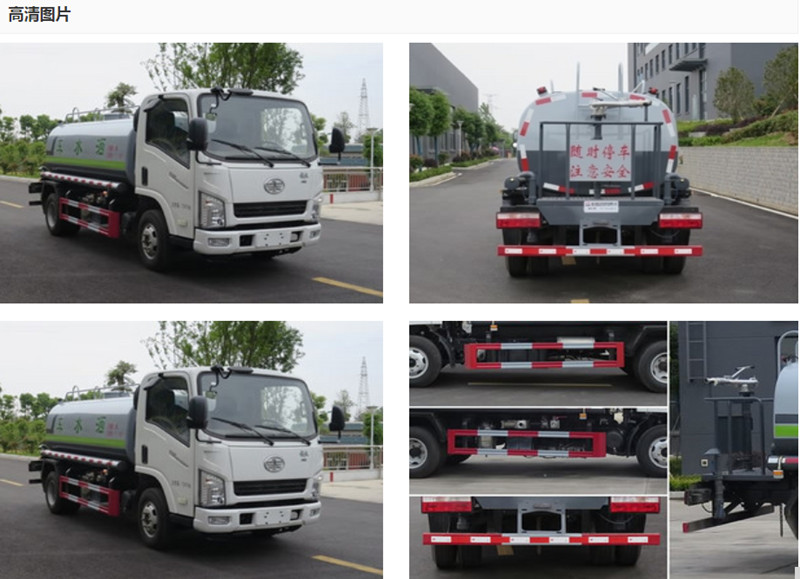 國六解放5噸灑水車,罐體容積5立方米,該車具有免征公告(可免交車輛購置稅)。采用武鋼4mm優質碳鋼板一次卷壓成型,完全做到無縫成型。罐體內設多道防波隔板,采用高壓氣體試漏檢測,使罐體具有強度高,重心穩,車輛運載安全平穩。罐體外表為烤漆,罐體及各保險杠貼紅白色視覺反光條,罐體兩側噴“綠化灑水車”字樣(可按您的要求噴繪字樣),罐體顏色出廠為上白下綠或上白下藍(可按您的要求噴繪顏色)。采用CA1070K2L3E6B底盤,錫柴130馬力發動機,外形尺寸:6200,5995 * 2000 * 2400,2700  (mm),六檔變速箱,總質量(kg) 7360 額定質量(kg) 3930 整備質量(kg) 3300 ,軸距3360mm,配40-50大功率水泵,帶前噴,后灑,側噴,水炮,后工作平臺。
