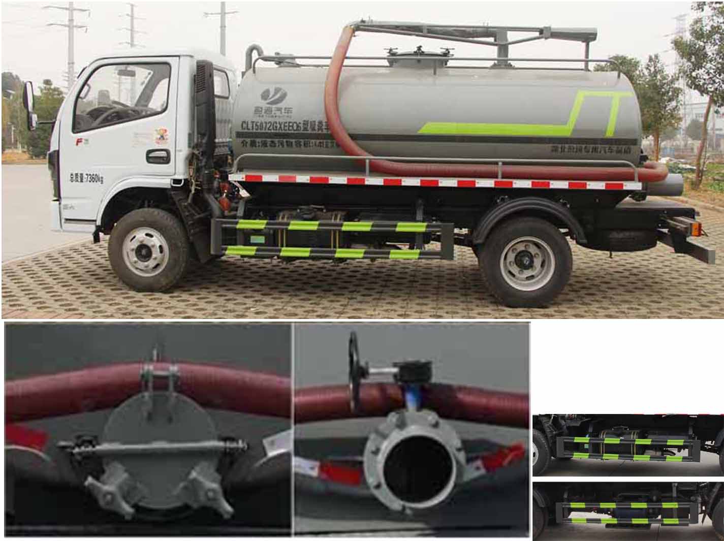 主要專用裝置:罐體及吸糞裝置,主要用于抽排運污水、糞便、泥漿等液態污物;罐體總容量4.63立方米,罐體有效容積4.41立方米,罐體外形尺寸(長×長軸×短軸)(mm):3500×1650×1200;ABS型號及生產廠家:3550D-1010C2000/東風福利企業公司;側/后防護材料Q235碳鋼,連接方式均為螺栓連接,后防護截面尺寸(寬×高)(mm)50×120,后部防護離地高度(mm):420.僅采用底盤3300mm軸距改裝.選裝后部出口樣式和側面樣式,隨底盤選裝水箱、空濾尿素罐、電瓶框等位置布局.