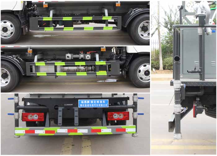 該車主要用于城鄉園林綠化噴灑作業;主要裝置為罐體及噴灑裝置.罐體總容量:4.03立方米;罐體有效容積3.84立方米;罐體外形尺寸(長×長軸×短軸)(mm):2900×1650×1200.側、后防護材料均為:Q235碳鋼,連接方式均采用螺栓連接,后部防護截面尺寸(mm):120×50,后部防護離地高度(mm):430.ABS系統型號:ABS-E;生產企業:威伯科汽車控制系統(中國)有限公司.ABS系統型號:ABS-VI.E;生產企業:廣州瑞立科密汽車電子股份有限公司.僅采用底盤3360mm軸距改裝.選裝噴灑裝置樣式,選裝大工作平臺,選裝后部不帶霧炮樣式.選裝前部不帶電子霧炮.選裝電子霧炮裝置樣式.前部安裝裝電子霧炮時,前伸為500mm,整車長度為6700mm.隨底盤選裝駕駛室,選裝噴灑裝置樣式.