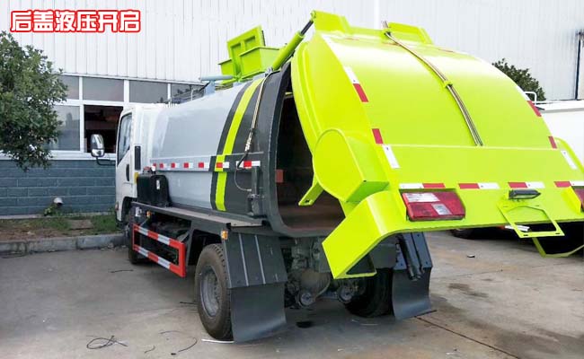 容積5~6立方米,方形箱體,碳鋼材質,內置推板卸料,箱體不帶舉升功能,箱體右側掛桶提升機構,上進料口液壓開啟,后蓋液壓開啟、鎖緊,采用國內知名液壓件,揚州多路閥。油缸、長源油泵。