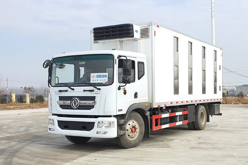 東風天龍前四后八全鋁合金運輸車,又稱鋁合金禽畜運輸車,可做三層或四層,品質更佳,車身結構采用鋁合金打造,不銹鋼噴頭和飲水頭,相比鋼制車體,重量減輕20%-30%,可以裝載更多的畜禽,空車行駛節約燃料,低維保費用,不生銹,生命周期無線延長,無需漆面保護,清潔簡單便捷,操作簡易,車廂升降平臺由全液壓控制,遙控操作更加簡便,自動恒溫系統,車廂設計合理方便控制家禽上下車,遙控升降車,動物福利,更大的 內部空間,家禽在車廂內更感舒適,溫度控制系統,沖淋飲水系統,遙控側面通風系統,可開合側窗系統,強制通風系統。