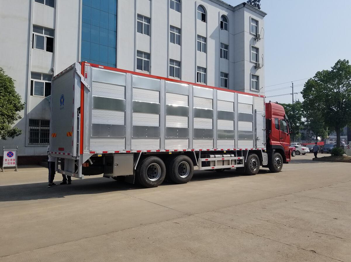 1、分層裝載機構:箱體內設置3-4層固定裝載機構,通過尾板液壓系統升降,實現豬崽每層裝卸,每層隔板配置分欄隔斷。