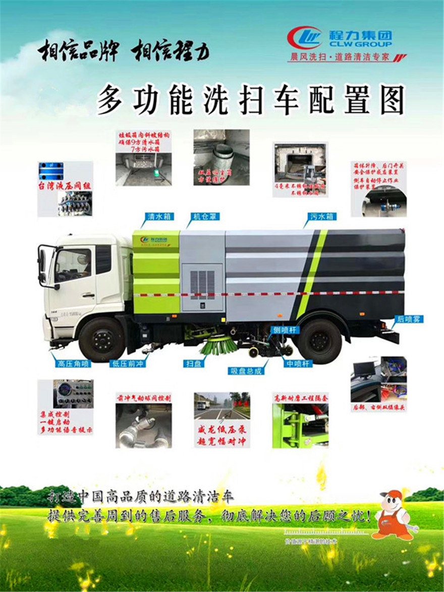 東風(fēng)8方洗掃車采用東風(fēng)型國五二類底盤改裝,加裝副發(fā)動機、風(fēng)機、高壓水泵、清水箱、垃圾箱、左右立掃、帶噴水桿的寬吸嘴、低壓沖洗系統(tǒng)、垃圾箱自潔,掃盤降塵系統(tǒng),液壓系統(tǒng)、專用裝置電控系統(tǒng)和副車架等改裝而成: