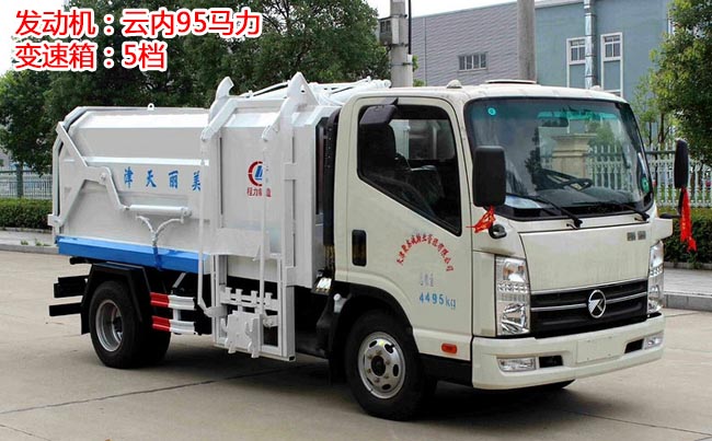 箱體容積5~6立方米,外形與掛桶垃圾車相似,箱體材料邊三底四碳鋼,內(nèi)部做防銹處理,側(cè)方帶掛桶提升機構(gòu),車尾部橡膠密封條,內(nèi)置推板,后蓋液壓開啟。