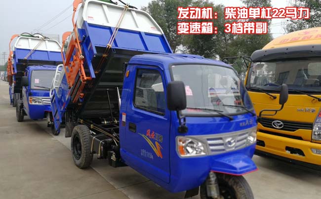 時風風云2號三輪掛桶式垃圾車,時風全封風云2號駕駛室,單杠22馬力柴油發(fā)動機,3檔帶副變速,方向盤式轉(zhuǎn)向,軸距2990,前輪6.00-14,后輪7.00-16。