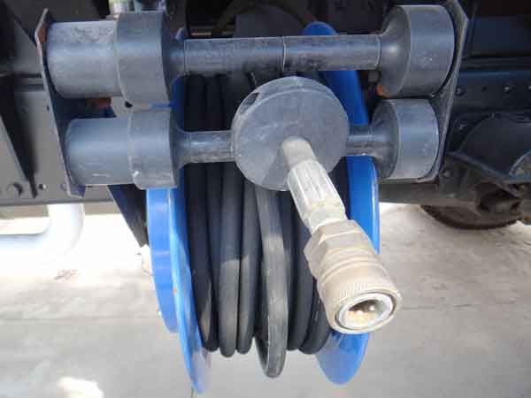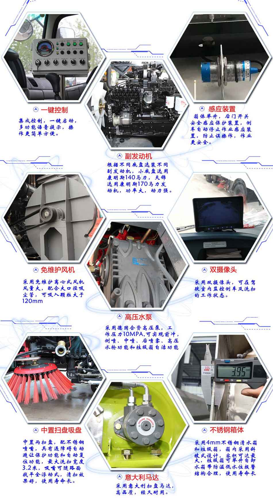 上裝配置:副發動機采用康明斯170馬力,自動離合器驅動風機和高壓水泵,有效減少風機啟動和停止時對發動機的沖擊,低噪音,低油耗量和節省成本等優點。采用洛陽北玻品牌,大功率耐磨免維護離心風機,無嗓音,效率高風量大,使用壽命長。高壓水泵采用合資國際知名德國品孚,T7012IR型柱塞柱,壓力高,最高壓力可達到16MPa。清水箱充分利用車載空間,容積達到9個方,內置水位報警器。垃圾箱采用雙層內膽不銹鋼結構,內部加裝過濾網板,有效地防止樹葉,塑料袋之類的輕飄物堵塞風口及灰塵排出,內置污水報警系統,可通過后門處污水閥方便的將污水排出下水道,最大限度的利用了垃圾箱裝載垃圾的空間,廂體采用傾翻卸料,帶高壓沖洗自潔裝置。
