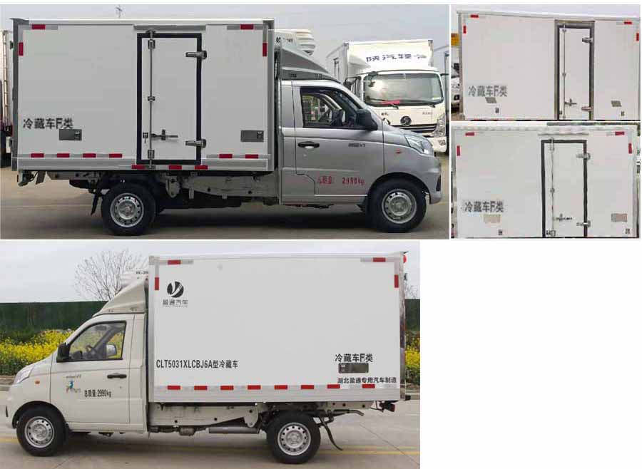 該車用于冷藏運輸的廂式汽車,裝備有隔熱結構的車廂和制冷裝置;貨廂頂部封閉,不可開啟.ABS系統控制方式是雙參數控制,ABS系統控制器型號是YF9,ABS系統控制器生產企業是武漢元豐汽車電控系統有限公司.發動機DAM15KR,DAM16KR分別對應的最大凈功率為80kW,85kW,分別對應最高車速100km/h,110km/h.發動機與油耗申報值(L/100km)對應關系為:DAM15KR/8.1,DAM16KR/7.5;選裝直接供電式ETC車載裝置.隨底盤選裝新前格柵和不帶導流罩.選裝側門樣式,選裝后部樣式;選裝同等功率制冷機組,外觀形狀可不同.該車型整備質量包含備胎、滅火器、隨車工具.貨廂重量為485kg,底板材質為玻璃鋼+擠塑聚苯乙烯,厚度為75mm或者79mm,側板材質為玻璃鋼+擠塑聚苯乙烯,厚度為75mm或者79mm.選裝廂體無側門樣式.