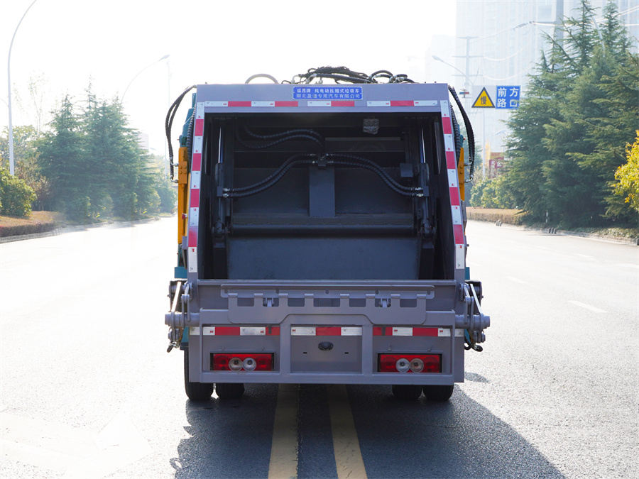 電動壓縮式垃圾車 該車專用裝置為垃圾箱體及液壓系統裝置,主要用于垃圾的收集,轉運作業;選裝后部上料裝置樣式;整車長度/軸距/后懸/后伸對應關系(mm):5995/2800/1740/330,5990/2900/1880/85;5995/2900/1880/90;ABS系統型號/生產企業:YF9/武漢元豐汽車電控系統股份有限公司;電池種類:磷酸鐵鋰電池,儲能裝置單體生產企業:湖北億緯動力有限公司,儲能裝置總成生產企業:湖北億緯動力有限公司;電機型號/生產企業:FTTBP100B/北汽福田汽車股份有限公司,額定功率:40kW,峰值功率:100kW;側防護材料為:鋁合金+Q235碳鋼,連接方式為螺栓連接;后防護為專用裝置代替,后部防護離地高度(mm):360;該車選裝直接供電式ETC車載裝置;該車型整備質量包含隨車工具,不包含備胎、滅火器;貨箱重量為:1830kg;底板材質為Q355鋼,厚度為3.0mm;側板、頂板材質為Q355鋼,厚度為3.0mm;僅采用2800mm,2900mm軸距改裝;選裝側面樣式;隨底盤選裝logo標識,選裝排半駕駛室,選裝前部標識.后部作業燈具僅在車輛駐車作業時開啟.