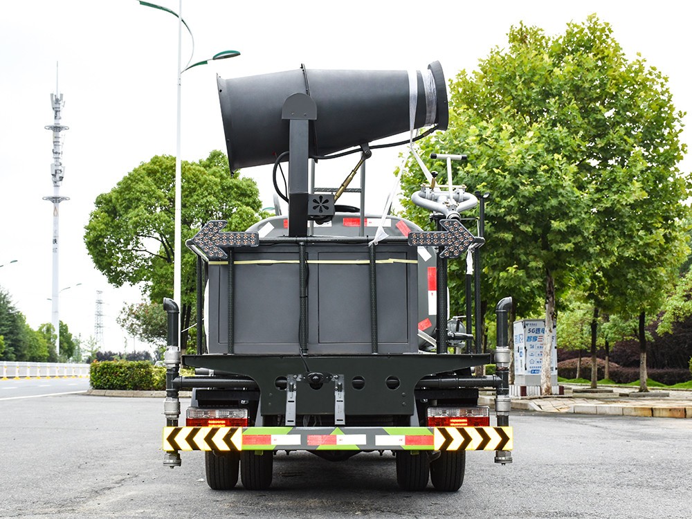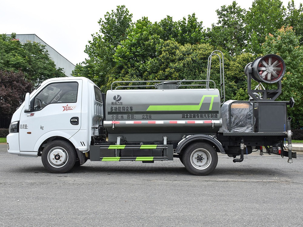 東風途逸 2.5 方抑塵車主要技術參數 序號 名稱 型號、規格 1 整車型號 CLT5040TDYEQ6 型多功能抑塵車 2 發動機型號 Q23-95E60 3 發動機馬力/功率 全柴 95 馬力/70KW 4 發動機排量 2300ML 5 變速箱 萬里揚 5 檔 6 輪胎規格 185 真空胎 7 軸距 2800 8 總質量 4495KG 9 整備質量 2880KG 10 額定載質量 1485KG 11 整車尺寸(長×寬×高) 5.8*1.85*2.6 12 罐體容積 2.5 方 13 燃料種類 柴油 14 排放標準 國六 15 水泵型號 40/50 16 罐體材質 Q235 碳鋼四. 產品功能展示 霧炮 后灑 后對沖 高炮 側噴