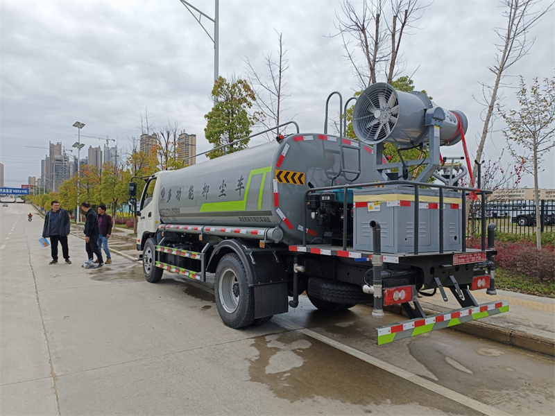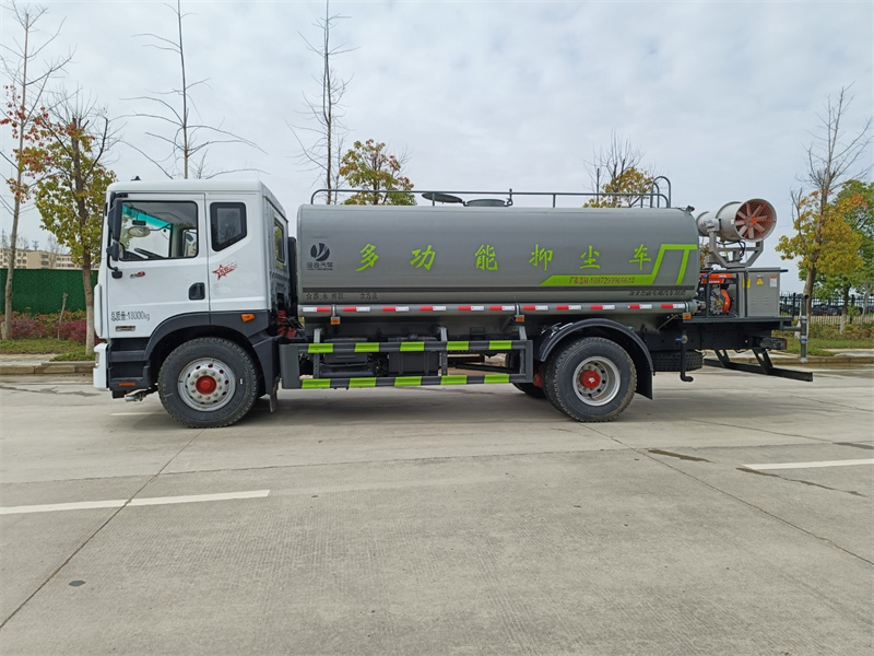 東風15-16噸霧炮灑水車產品標配前噴(鴨嘴)、后沖、后灑、側噴、后置式工作 平臺,平臺上配置綠化水炮(可 360°旋轉,既可以調成柱狀,也可 以調成霧狀,更可以調成直沖狀、大雨、中雨、小雨、毛毛雨),配 備優質大功率專用灑水泵(可自吸自排,可從河里或池塘抽水到罐體), 取力器,雜物過濾網,消防接口,自流球閥系統、取力器、球閥、濾網 均為國家標準產品,主管道加粗,法蘭墊、法蘭盤加厚,大通徑球閥。 整體具備性能優良安全可靠、效率高、流量大、維修方便等特點