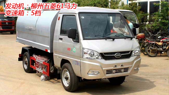 凱馬密封式垃圾車底盤配置:后雙輪,柳州五菱87馬力,5檔變速箱,175R14LT真空胎,方向助力,ABS